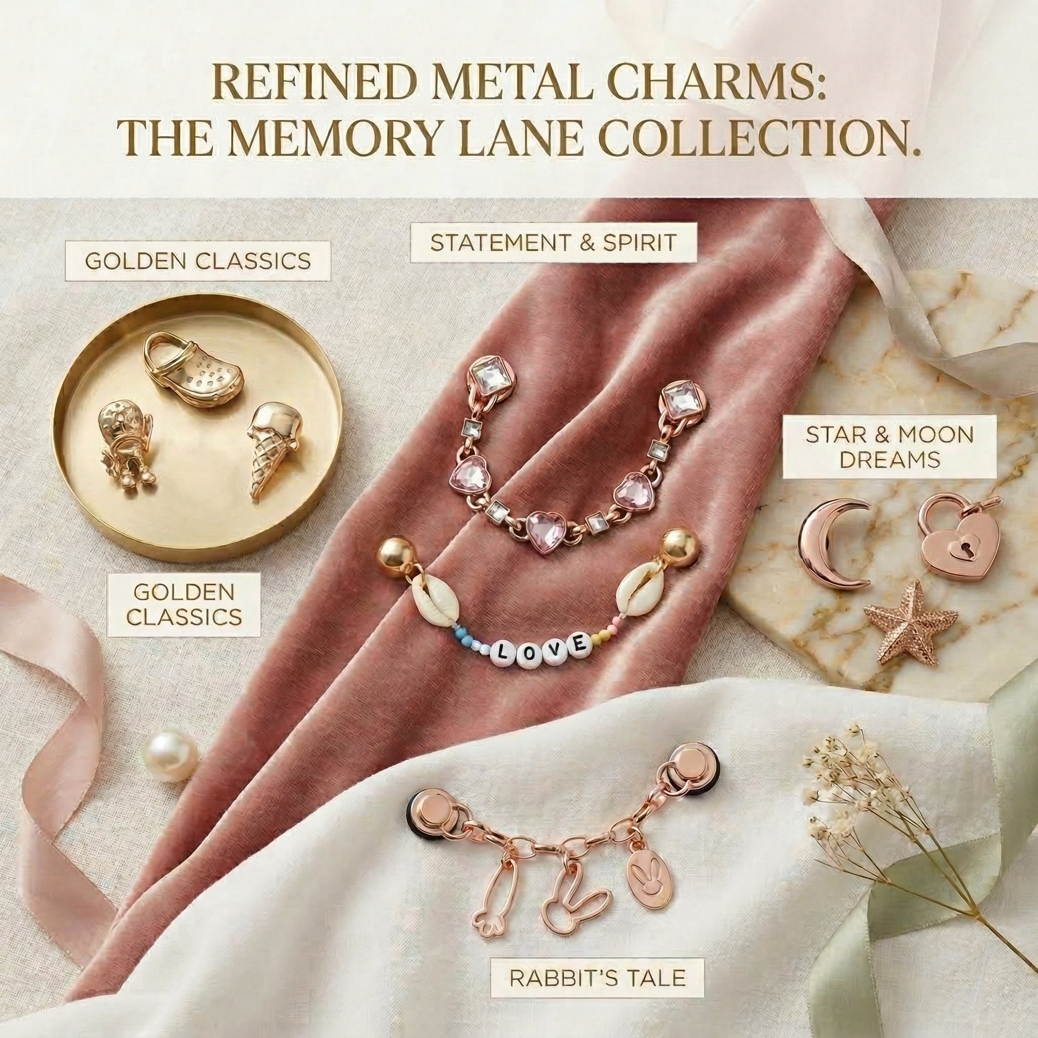 Share the love and match with your favorite person! Our Besties & Soulmates Collection features premium, jewelry-inspired shoe charms designed for best friends, soulmates, and close-knit circles. With elegant gold trims, sparkling crystal accents, and sentimental messages, these charms are the ultimate way to show off your bond.